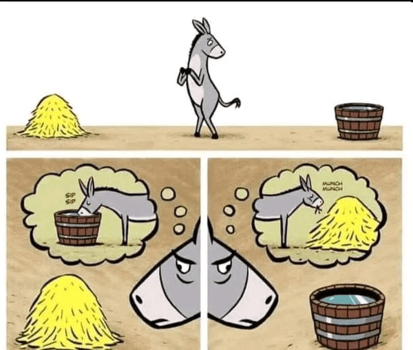 تتخيل المفارقة حمارًا جائعًا وعطشان يقف بالضبط بين كومة من القش ووعاء من الماء. نظرًا لأن الحمار يعاني من الجوع والعطش بنفس القدر، فإنه يتردد بين الأكل والشرب. وبسبب التعادل التام بين دوافعه، لا يستطيع اتخاذ قرار، يموت في النهاية من الجوع والعطش.